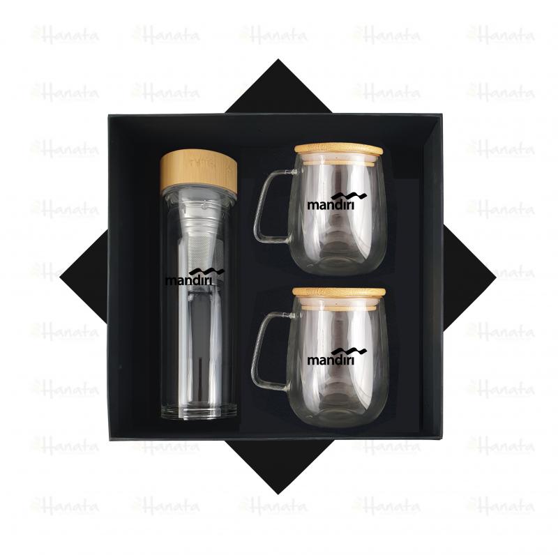 Double wall borosilicate glass thermo bottle with tea infuser and bamboo lid.